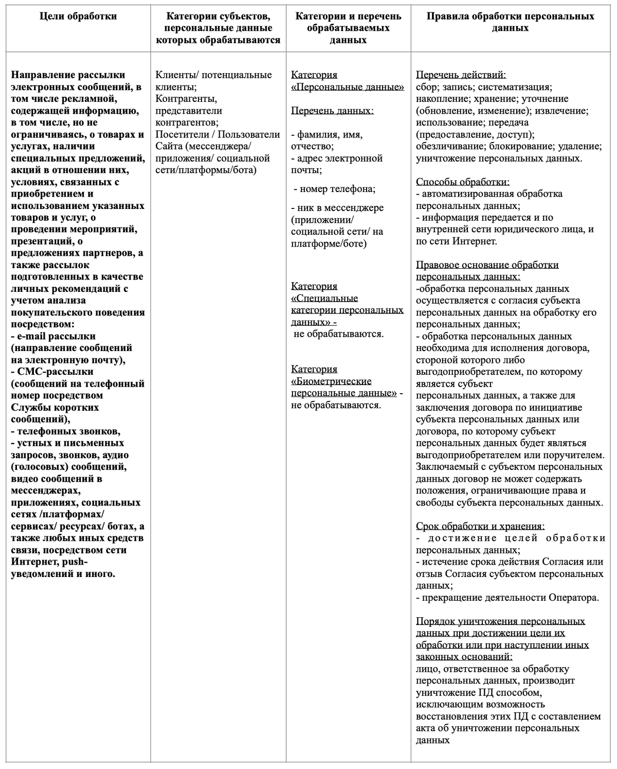 — или иным аналогичным текстом, при условии, что Субъекту персональных данных в каждом месте сбора персональных данных предоставлена возможность ознакомиться с полным текстом Политики обработки персональных данных, Согласием на обработку персональных данных, Согласием на информационно-рекламную рассылку.